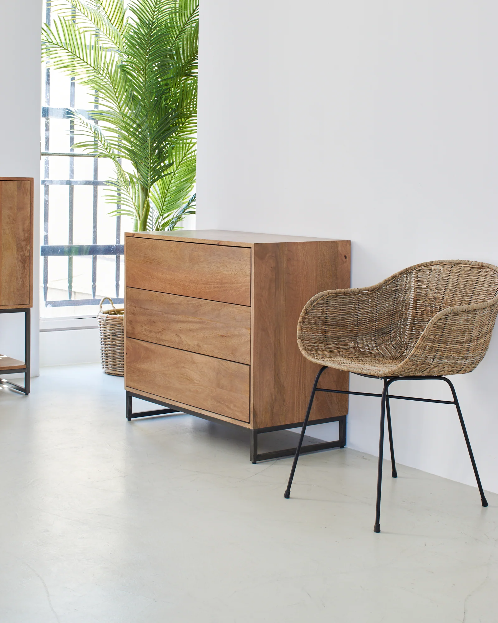 La cassettiera in legno e ferro Skyline è un pezzo di arredamento di design moderno e essenziale. Realizzata in legno di mango massello con finitura naturale color miele con base in ferro dipinto a polvere di colore grigio satinato, è una cassettiera moderna di design dalle linee essenziali e pulite enfatizzate ulteriormente dalla assenza di maniglie, pomelli o gole per l'apertura dei cassetti.