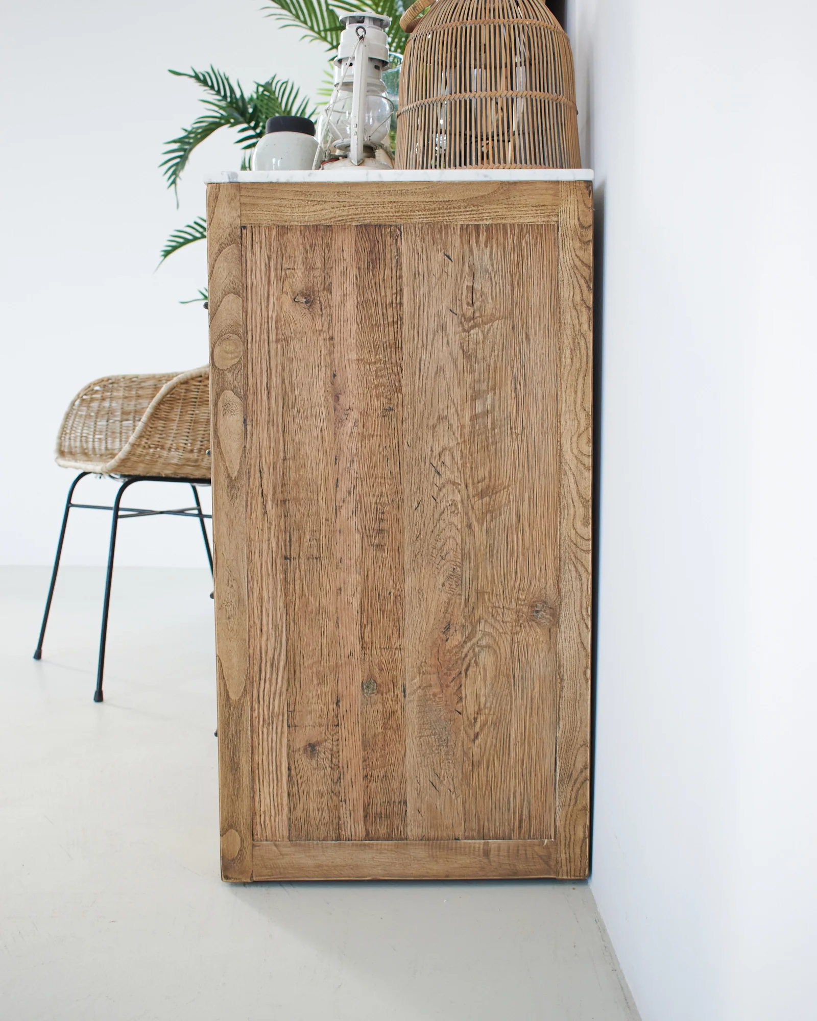 - materiali: legno di rovere di recupero colore naturale e top in marmo bianco con venature grigie