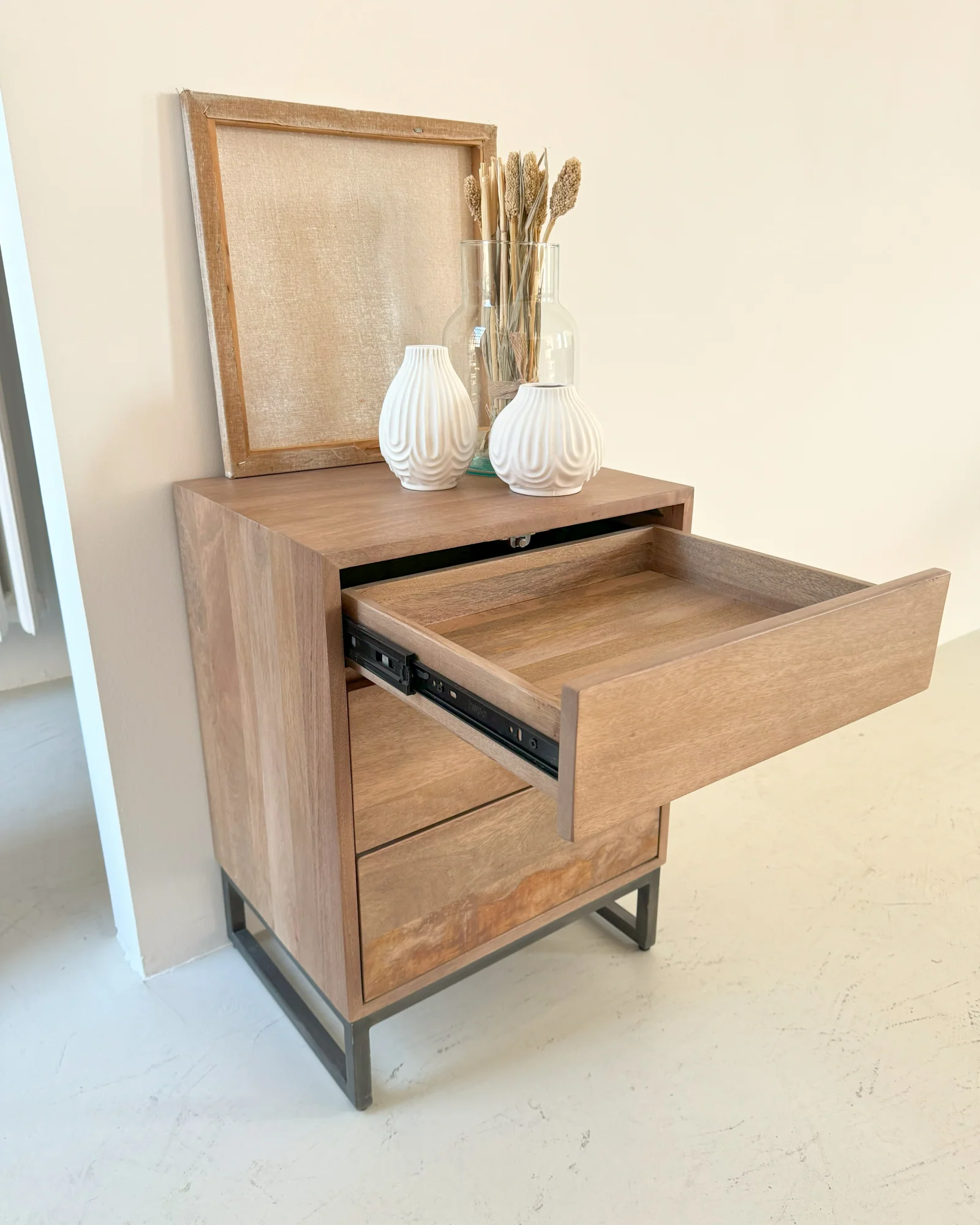 Il comodino in legno e ferro Skyline è un pezzo di arredamento di design moderno e essenziale. Realizzato in legno di mango massello con finitura naturale color miele con base in ferro dipinto a polvere di colore grigio satinato, è un comodino moderno di design dalle linee essenziali e pulite enfatizzate ulteriormente dalla assenza di maniglie, pomelli o gole per l'apertura dei cassetti.