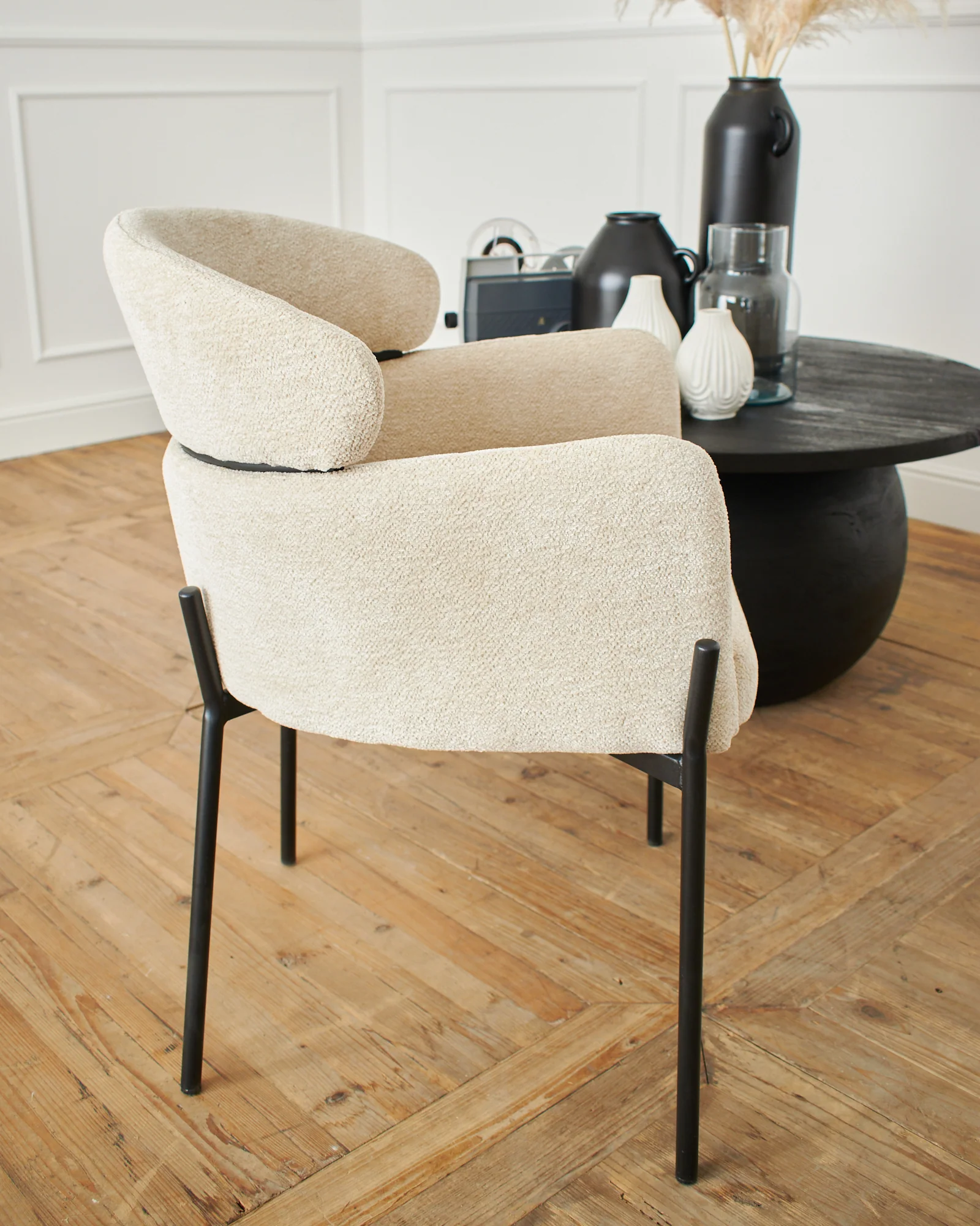 La sedia con braccioli in tessuto e ferro Maryland è realizzata con un rivestimento in tessuto di poliestere di colore ecru effetto velluto e struttura in ferro nero con finitura opaca. Le sue linee eleganti e le forme avvolgenti ne fanno una seduta confortevole e raffinata che ben si abbina a tavoli da pranzo importanti. Adatta anche come poltroncina o seduta da scrittoio è un pezzo elegante e di dal design originale.