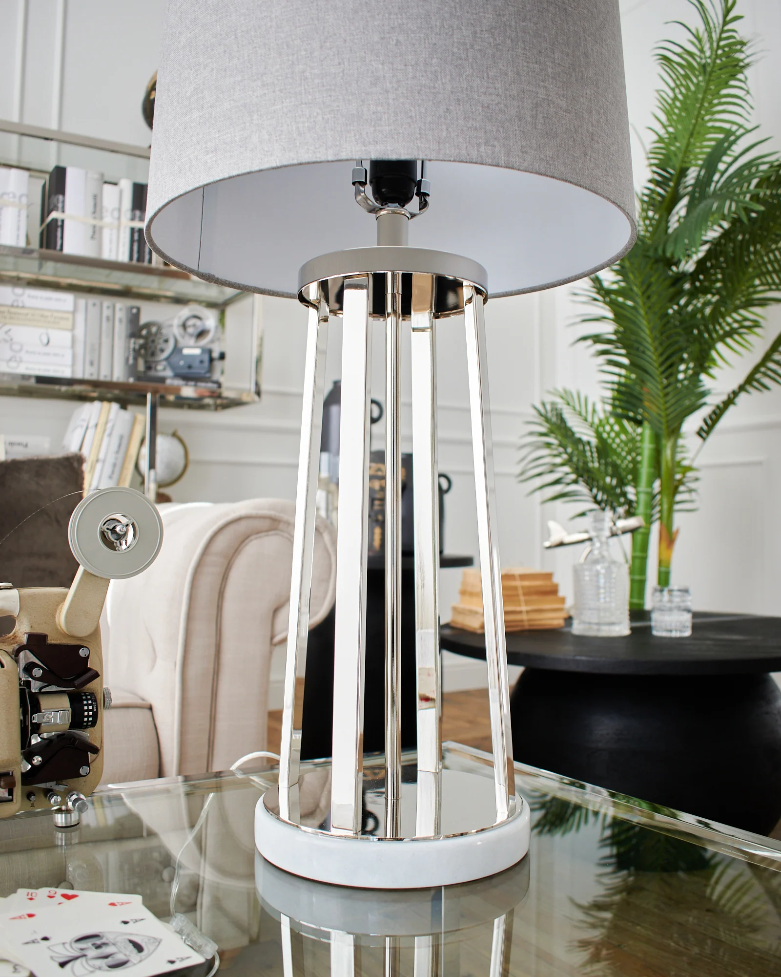 Questa lampada da tavolo New York Club è realizzata in acciaio con finitura cromata ed è accompagnata da un paralume in cotone e lino di colore grigio e da una massiccia base in quarzite di colore bianco. Le sue linee semplici e pulite si fondono perfettamente alla preziosità dei materiali creando un pezzo di arredamento elegante, sofisticato e di grande impatto.
