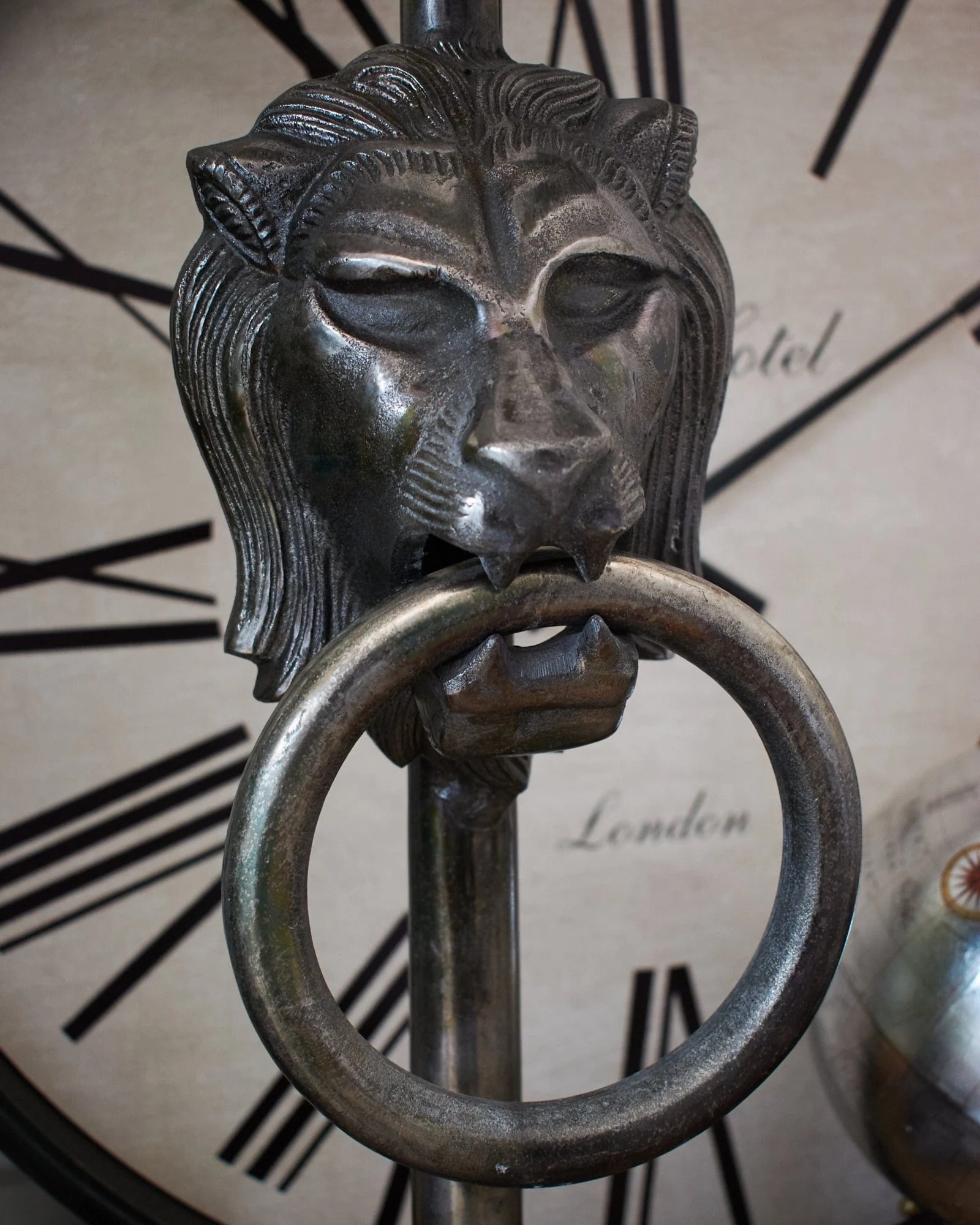 La lampada da tavolo St. Andrews è realizzata in fusione di alluminio con finitura anticata e brunita e accompagnata da un paralume in juta di colore grigio. Le dimensioni generose, l'originale medaglione che rappresenta la testa di un leone e la finitura color argento anticato e brunito sono carattere distintivo e unico.
