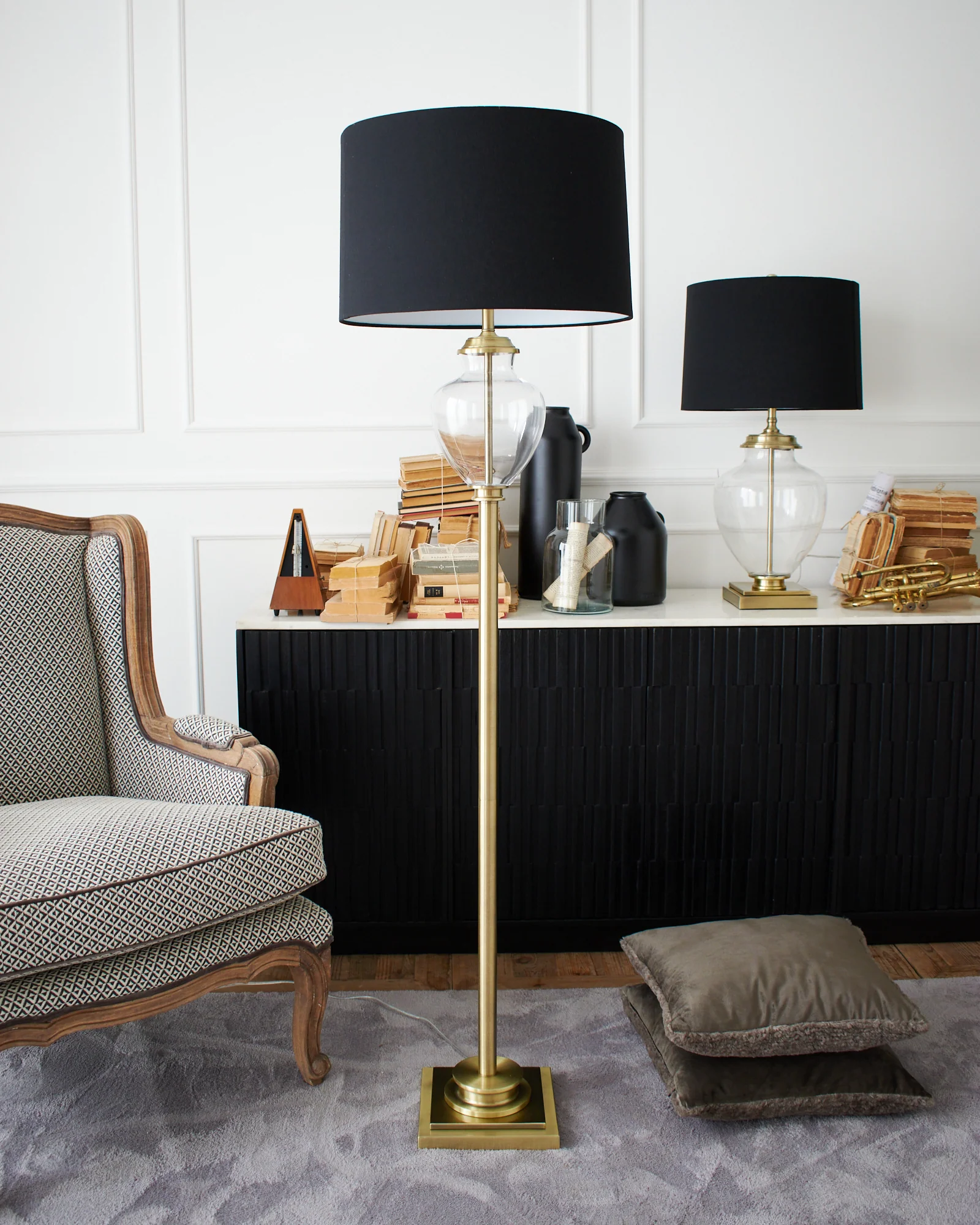 La lampada da terra Pigalle è realizzata in metallo color oro anticato e satinato e vetro ed è accompagnata da un paralume in cotone di colore nero. Le sue linee eleganti e opulente che richiamano le urne neoclassiche si fondono perfettamente alla preziosità dei materiali creando un pezzo di arredamento sofisticato e di grande impatto.