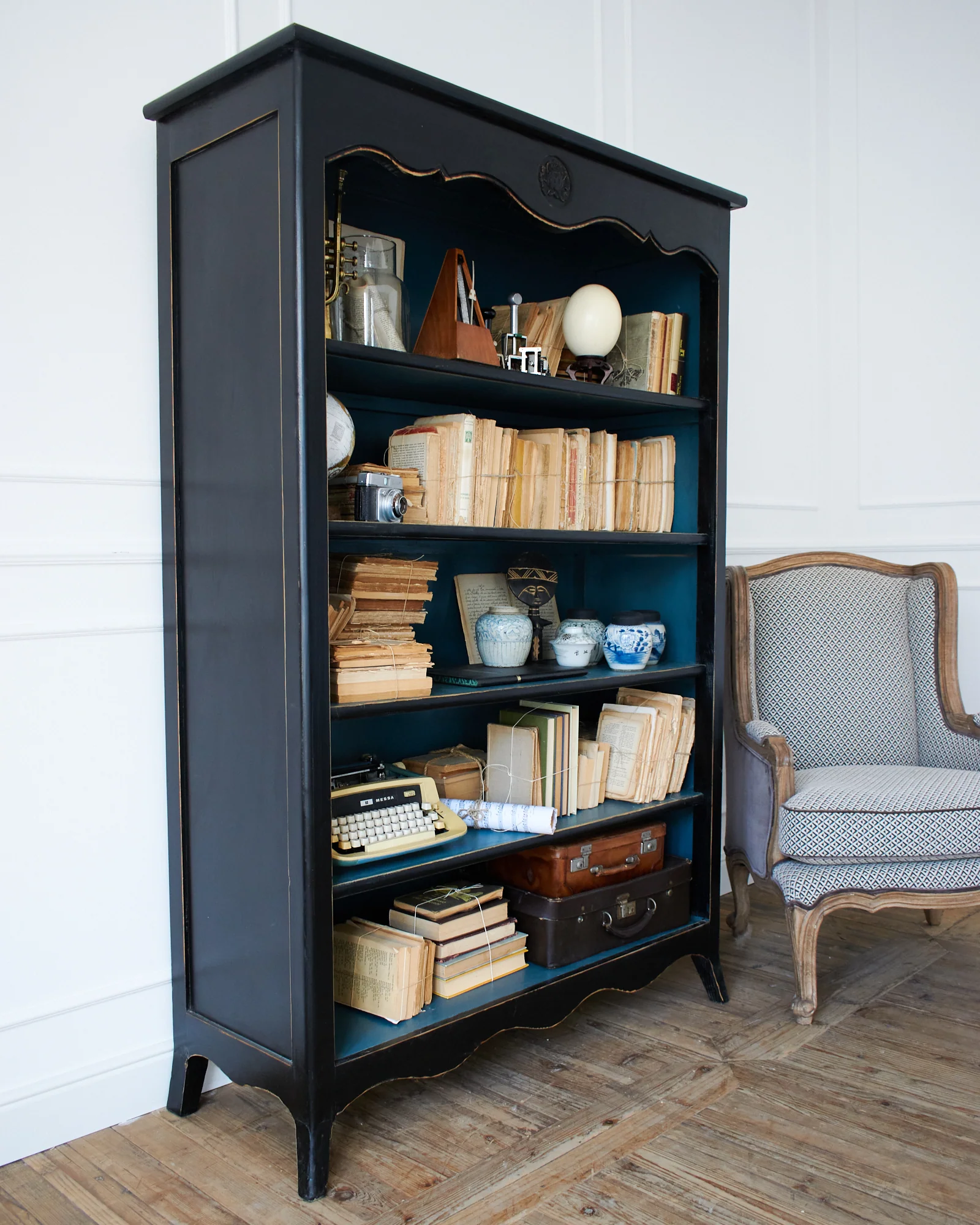 La libreria Cabinet de Curiosités è realizzata in legno di pino e dipinta esternamente di un deciso colore nero anticato e internamente di un magnifico color cobalto che farà da giusto sfondo ai tuoi libri e oggetti più particolari. Il suo design classico e retro è reso originale e inaspettato proprio grazie alla combinazione di colori con i quali è realizzata: uno splendido involucro che aspetta solo di essere personalizzato da te!
