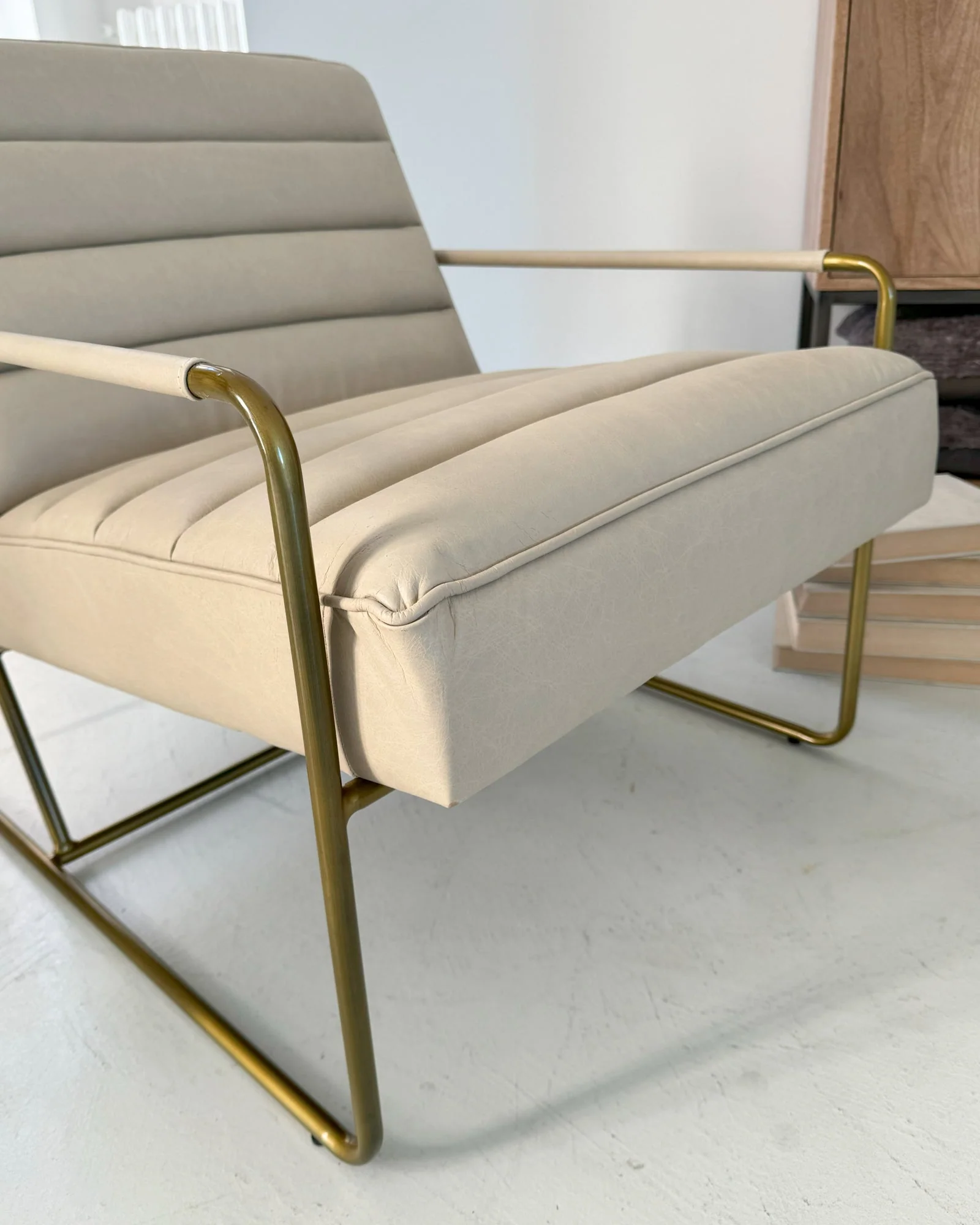 La poltrona in pelle e ferro Morrison, realizzata in pelle color sabbia con effetto invecchiato è l'ideale per chi ama l'eleganza e il design moderno e razionale. L'elegante struttura in ferro di colore ottone satinato gli conferisce un tocco di contemporaneità e leggerezza delle forme semplici e contenute.