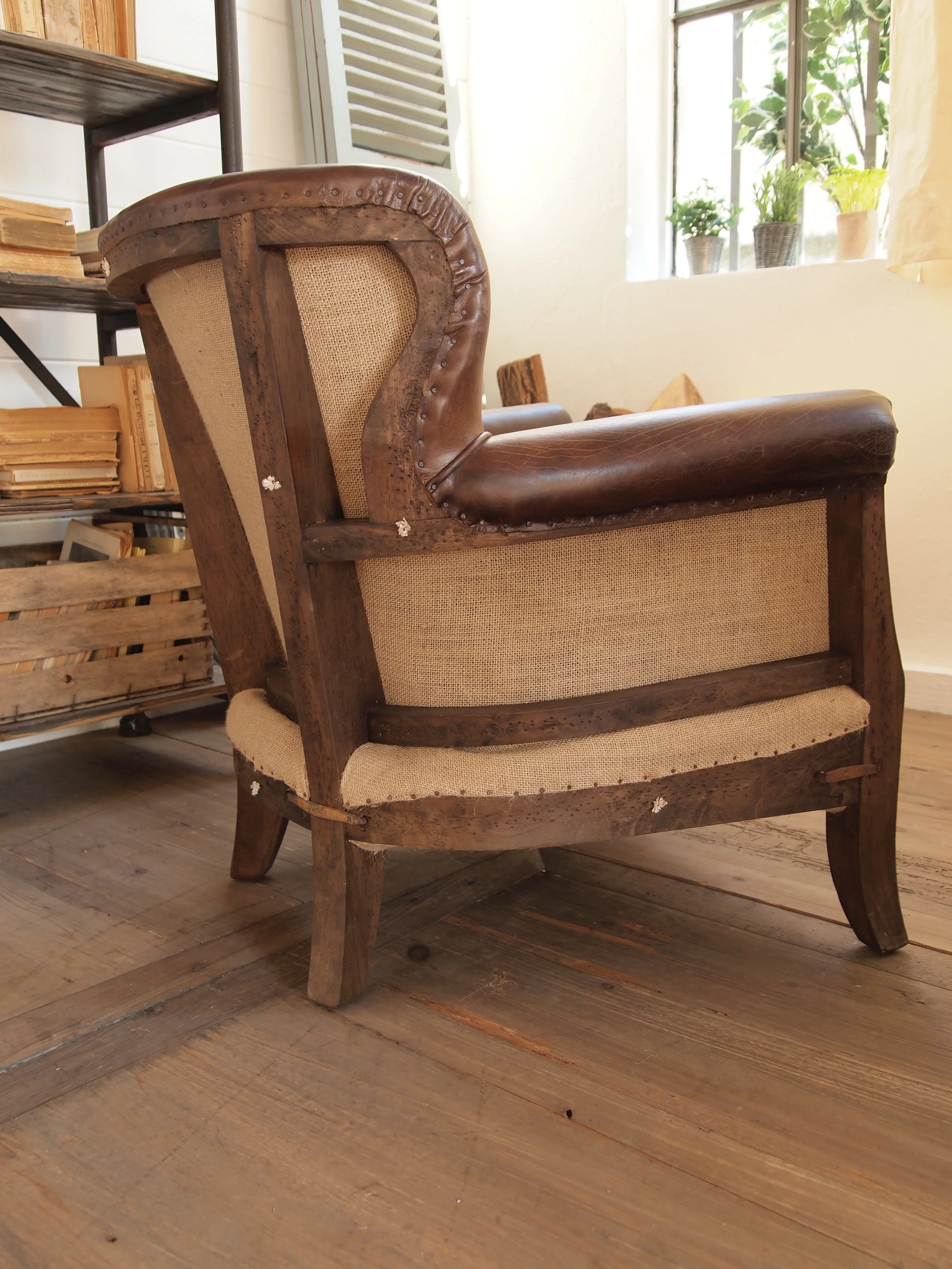 - materiali: pelle colore marrone invecchiato, struttura in legno di rovere, fianchi e retro in juta naturale