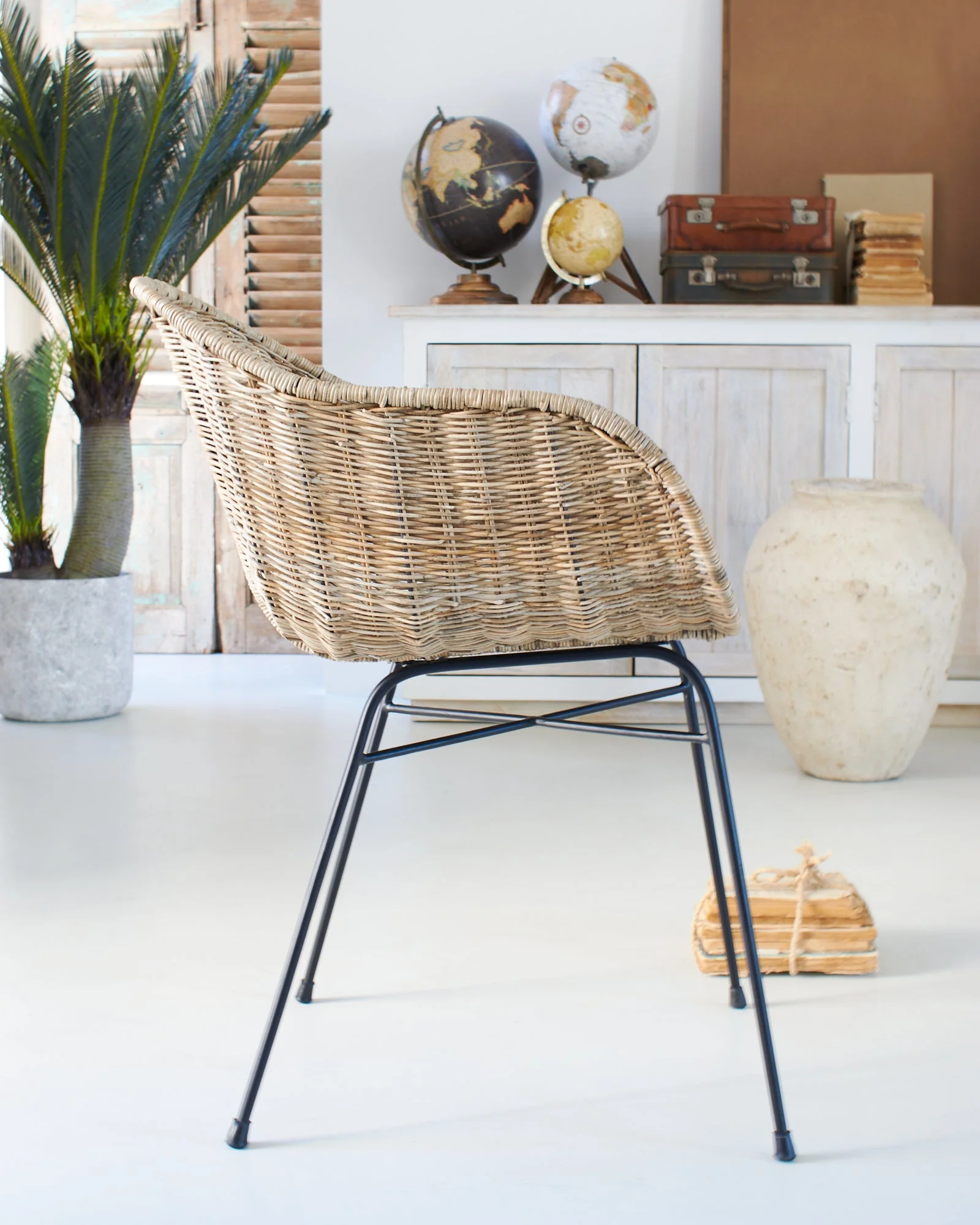 La poltroncina in rattan e ferro Teulada è realizzata con un'esclusiva combinazione di materiali naturali e colori neutri. Il rattan naturale artigianalmente intrecciato da mani sapienti è abbinato a una struttura in ferro di colore nero opaco. Le sue linee semplici e avvolgenti la rendono un pezzo particolarmente confortevole e abbinabile a qualsiasi ambiente.