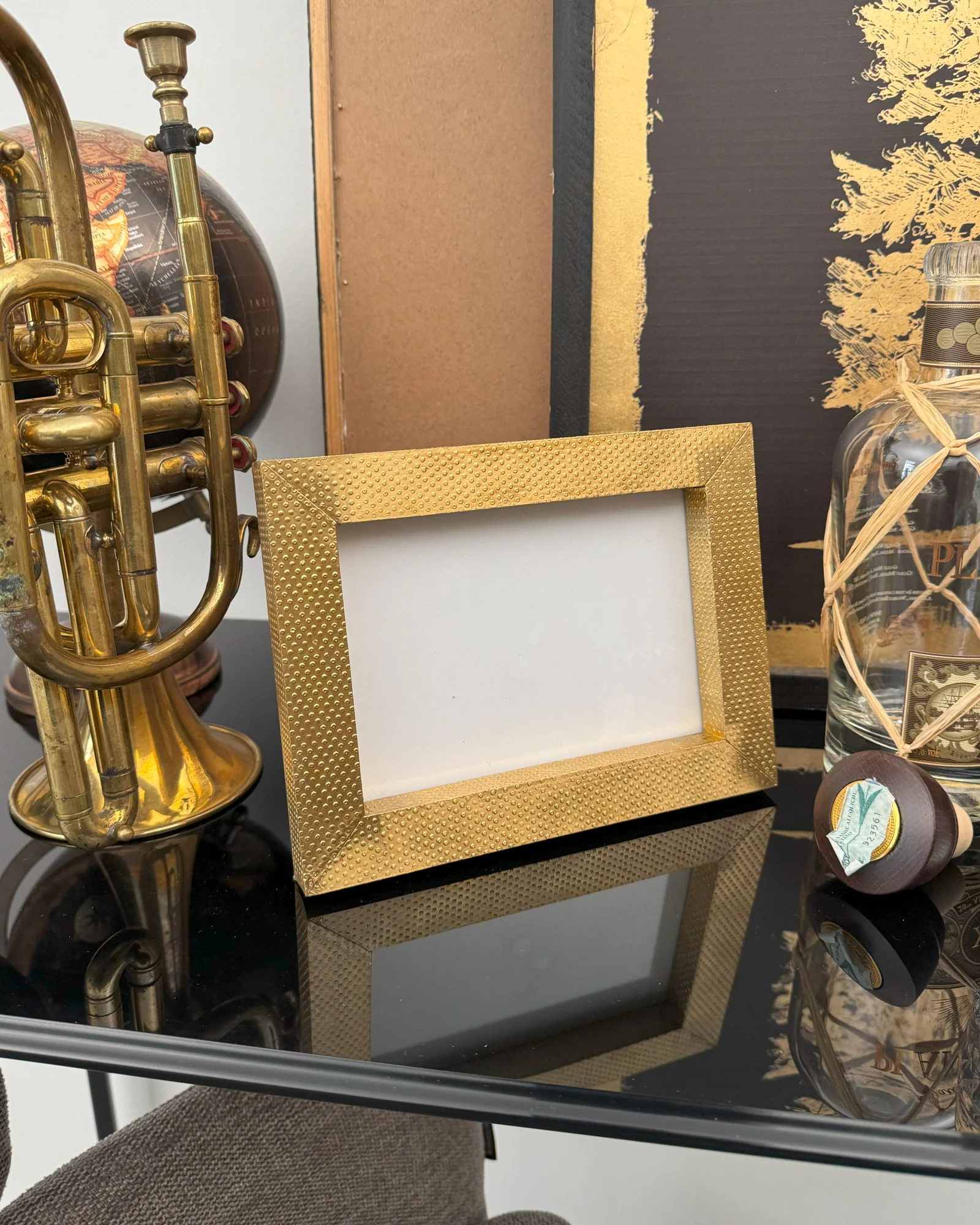 Il portafoto Jaipur è realizzato in lamiera di metallo applicata su un supporto in legno e impreziosita da una finitura dorata e una lavorazione puntinata. Lo spessore molto profondo e la lavorazione a rilievo diverso contribuiscono a dare alla superficie un effetto materico e originale. Rappresenta un oggetto elegante e raffinato, perfetto per decorare con stile la tua casa.