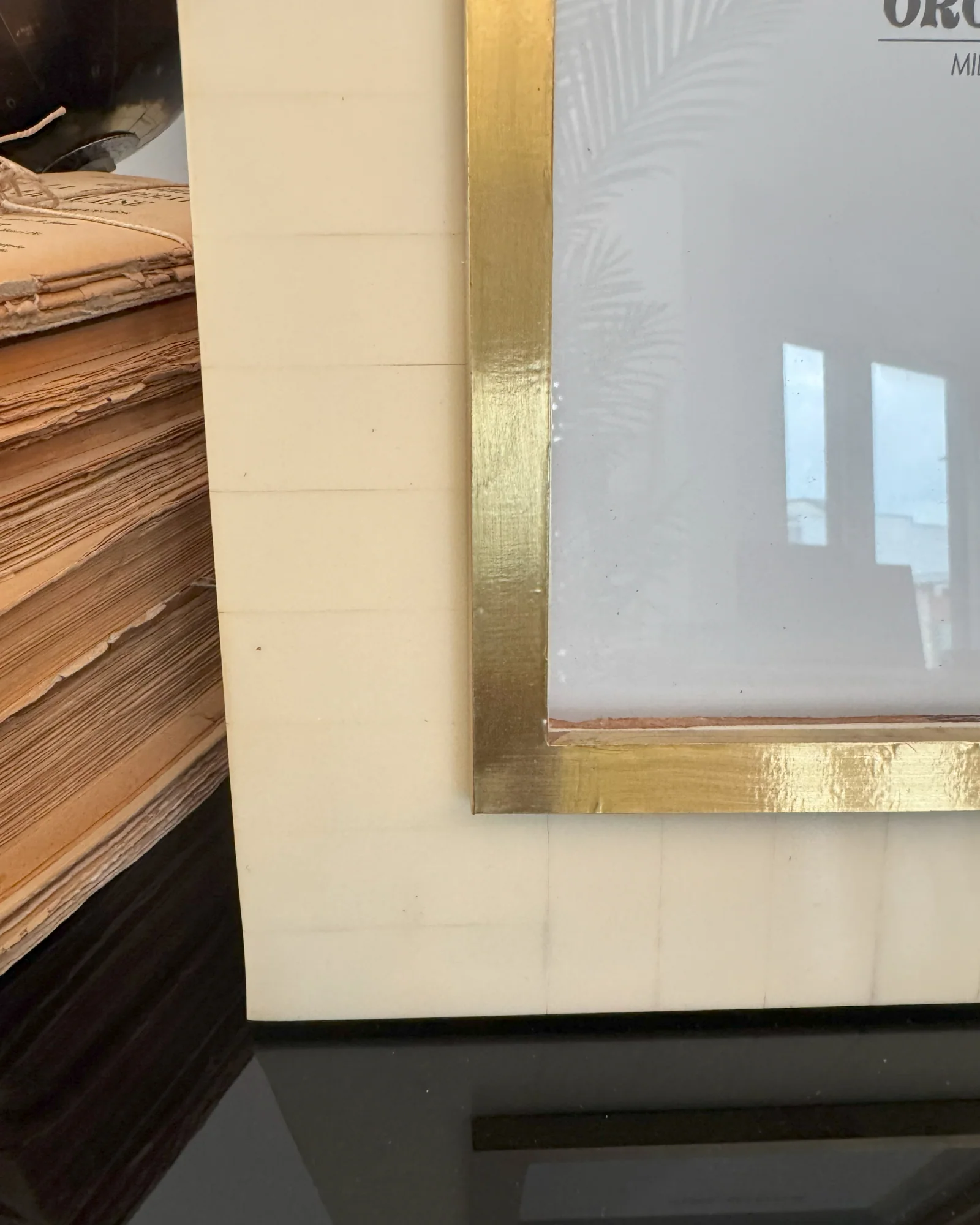 Il portafoto Conchita è realizzato con tessere di osso sbiancato applicate su un supporto in legno e impreziosito dal bordo interno in rilievo in metallo dorato, capace di dare particolare risalto alle tue fotografie. Rappresenta un oggetto elegante e raffinato, perfetto per decorare con stile la tua casa.