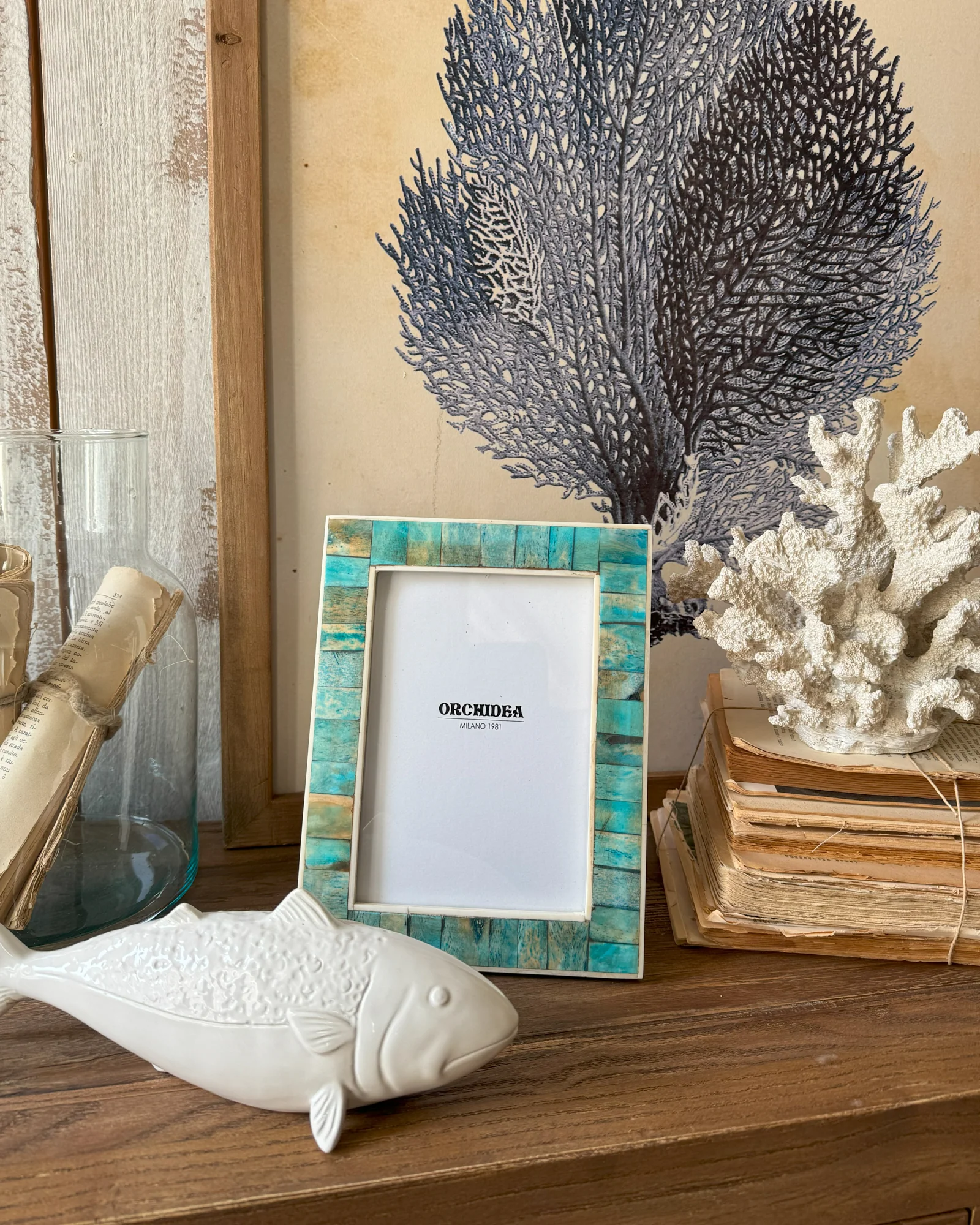 Il portafoto Turquoise, dalle magnifiche sfumature che ricordano i colori del mare, è realizzato con tessere di osso tinto di colore turchese applicate su un supporto in legno e impreziosito dai bordi interni e esterni in osso sbiancato. Rappresenta un oggetto elegante e raffinato, perfetto per decorare con stile la tua casa e dare risalto ai tuoi ricordi più belli.