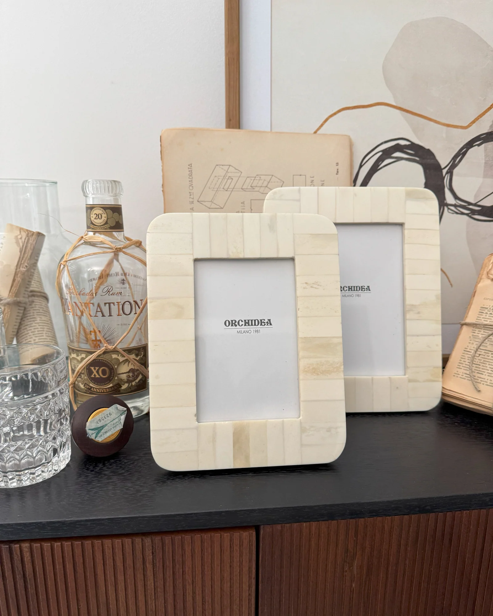 Il portafoto Estelle è realizzato con tessere di osso sbiancato applicate su un supporto in legno e impreziosito da tanti dettagli che lo rendono unico e ne ingentiliscono le forme, come gli angoli smussati e i bordi anche essi in osso. Rappresenta un oggetto elegante e raffinato, perfetto per decorare con stile la tua casa.