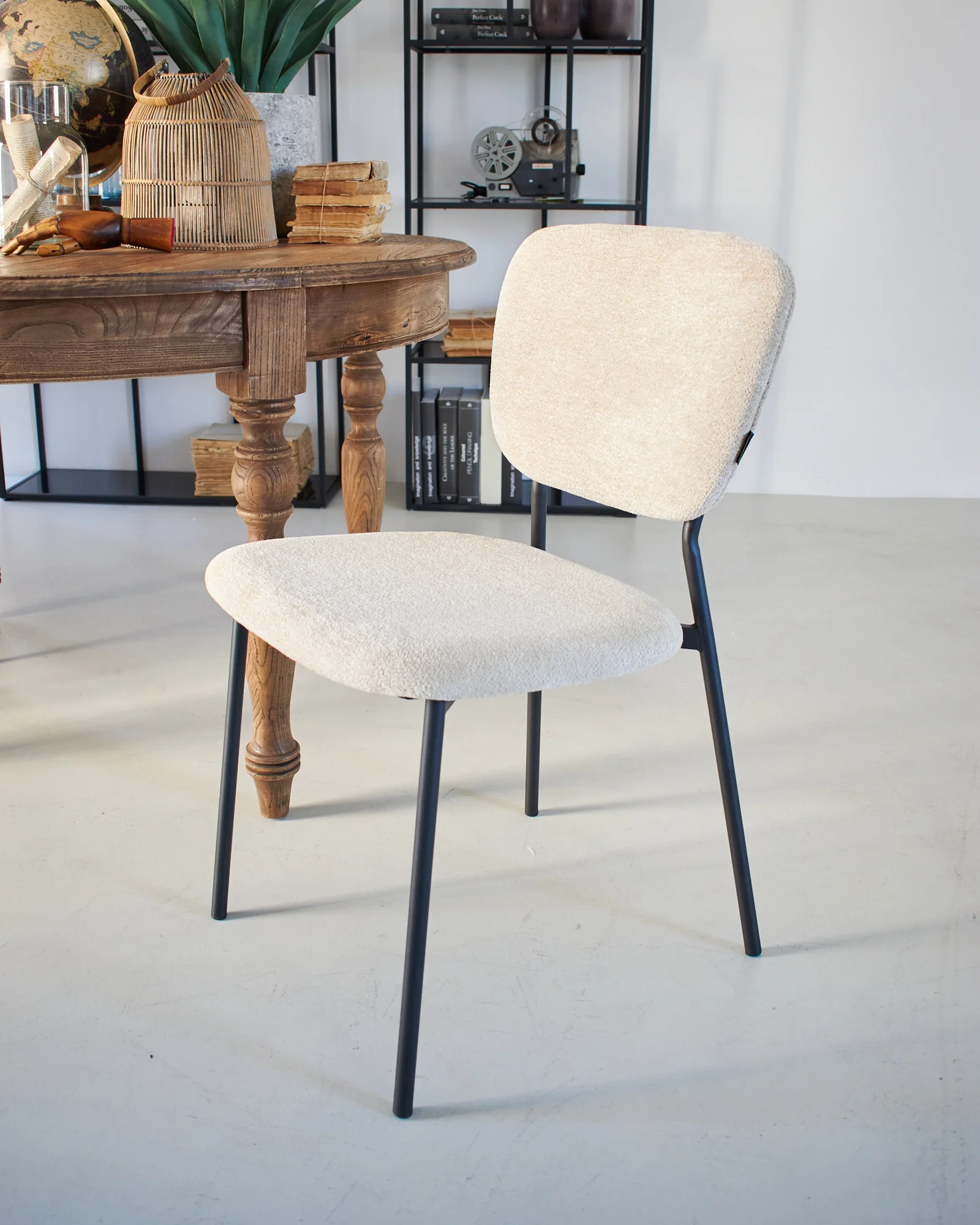 La sedia in tessuto e ferro Baltimora è realizzata con un rivestimento in tessuto di poliestere di colore ecru effetto velluto e struttura in ferro nero con finitura opaca. Le sue linee semplici e pulite, il colore neutro e le dimensioni contenute ne fanno un elemento di arredo particolarmente versatile e adatto a ogni tipo di tavolo moderno.