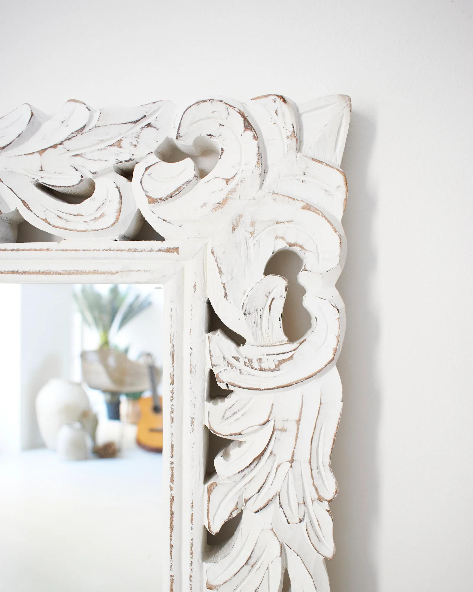 Rendete la vostra casa più casa più viva e fresca con la specchiera da parete in legno di mango massello Mykonos dal magnifico colore bianco anticato. Le sue dimensioni generose e il prezioso intaglio, eseguito artigianalmente da mani sapienti e capace di esaltare la bellezza del legno, sapranno dare un tocco di eleganza ai vostri spazi e di profondità anche agli ambienti più ridotti.