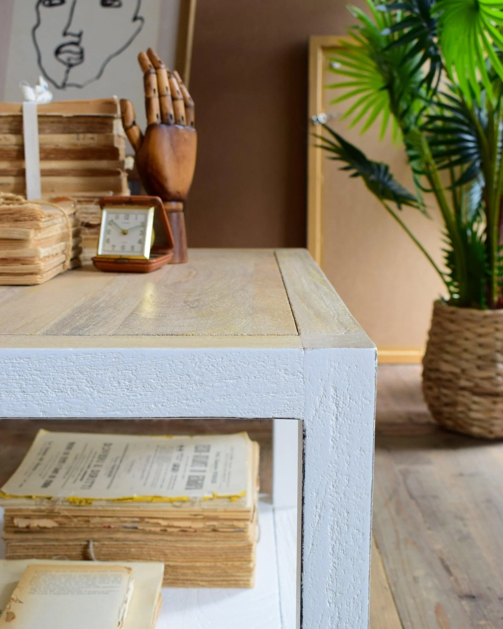 - materiali: legno di mango massello finitura sabbiata e spazzolata, colore bianco anticato e naturale