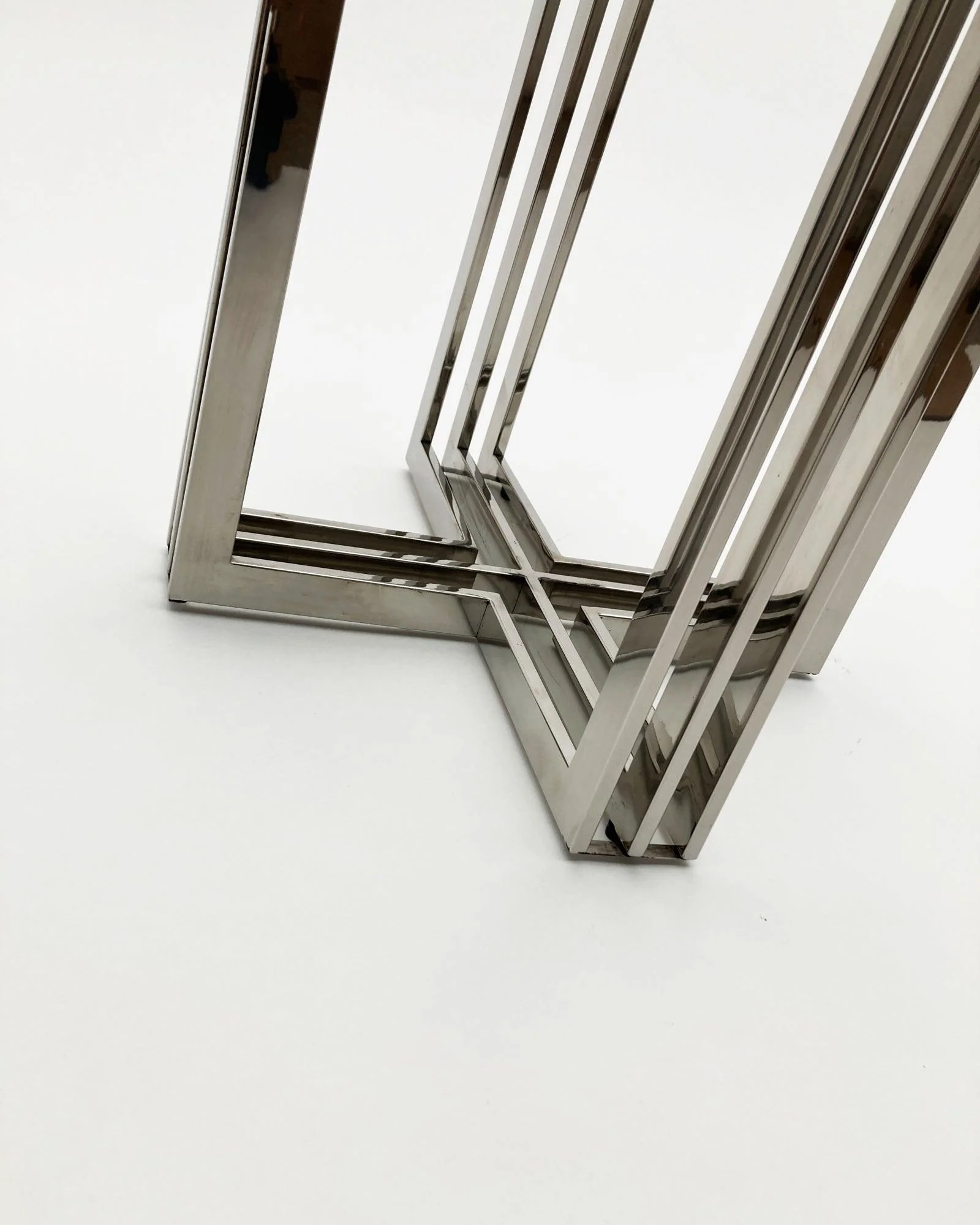 - materiali: struttura in acciaio lucidato, piano in vetro trasparente temperato
